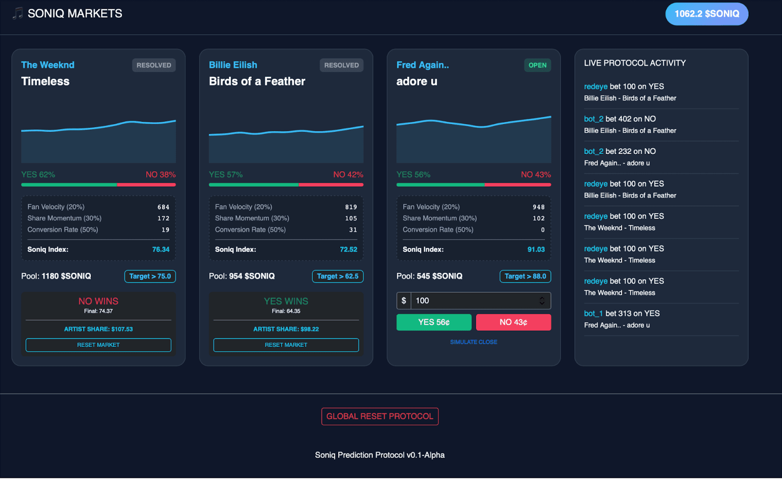 An artist releases a track, they have a landing page with presaves, links to Spotify, Apple Music, etc. Every time a user interacts with this page (and the tracks on other platforms), we have data, and the artist progresses with their marketing (and hopefully revenue). The user/fan has a challenge on the artist's landing page “will this track reach 50 presaves by Friday?” or “will this track make 100,000 Spotify streams by May?” - the user can then agree or disagree with this by staking some AMPS on YES or NO. The more people that do this, the more the pot increases. When the event challenge is over and the outcome is verified, the pot pays out to the winners. The artist, however, gets a share of the pot or the profit from the pot no matter the outcome.